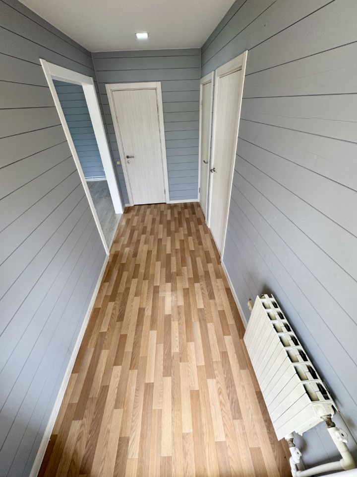Внутренняя отделка: стены имитация бруса, ламинат в комнатах, линолеум в коридоре , плитка в душевой , натяжные потолки .