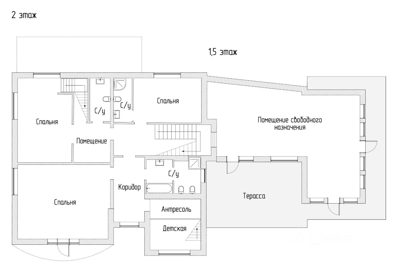 Между этажами - просторная зона отдыха с выходом на открытую террасу.