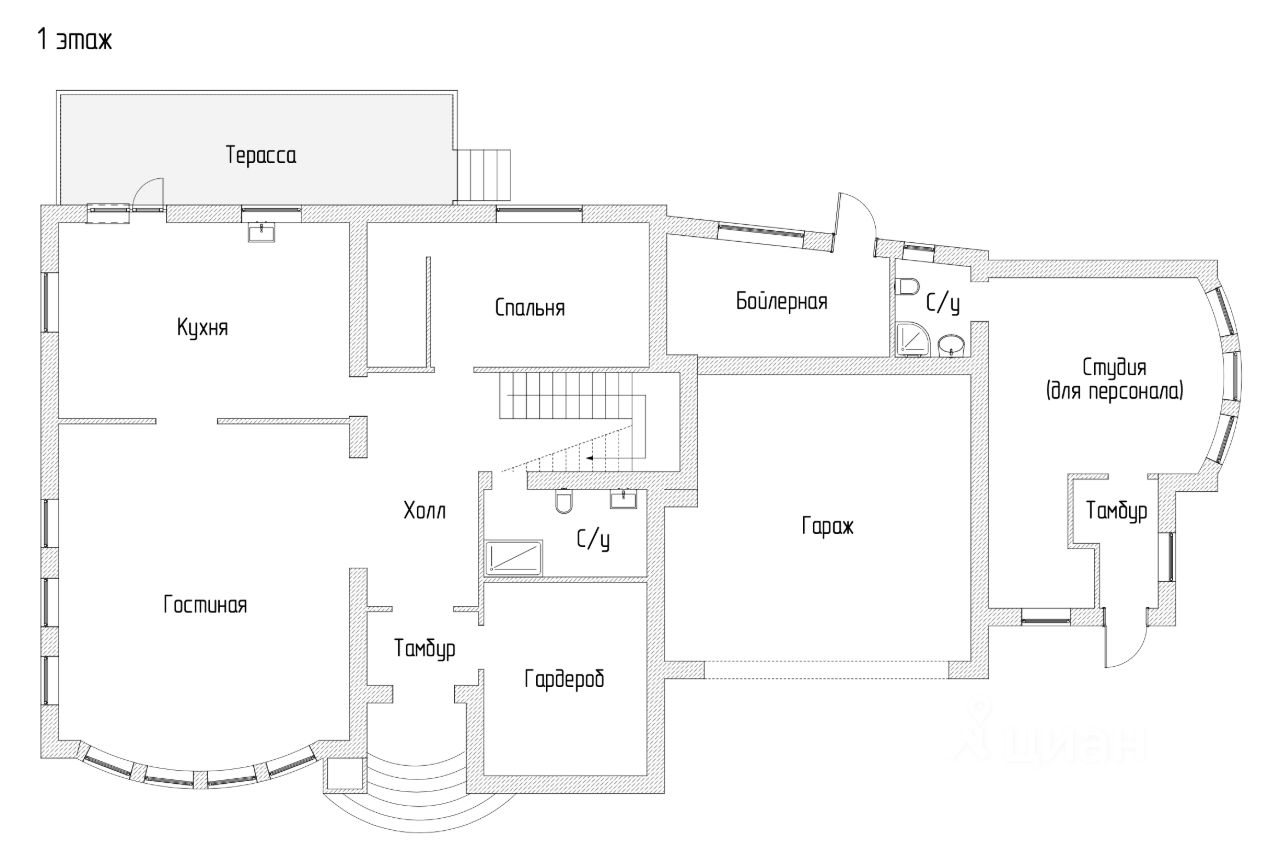 Пристройка - гараж на 2 автомобиля, полноценная студия для персонала/охраны с отдельным входом, санузлом и выводами под кухню, бойлерная.