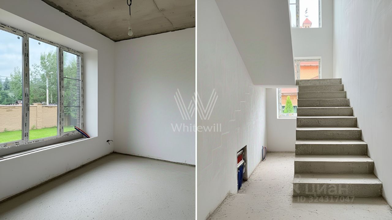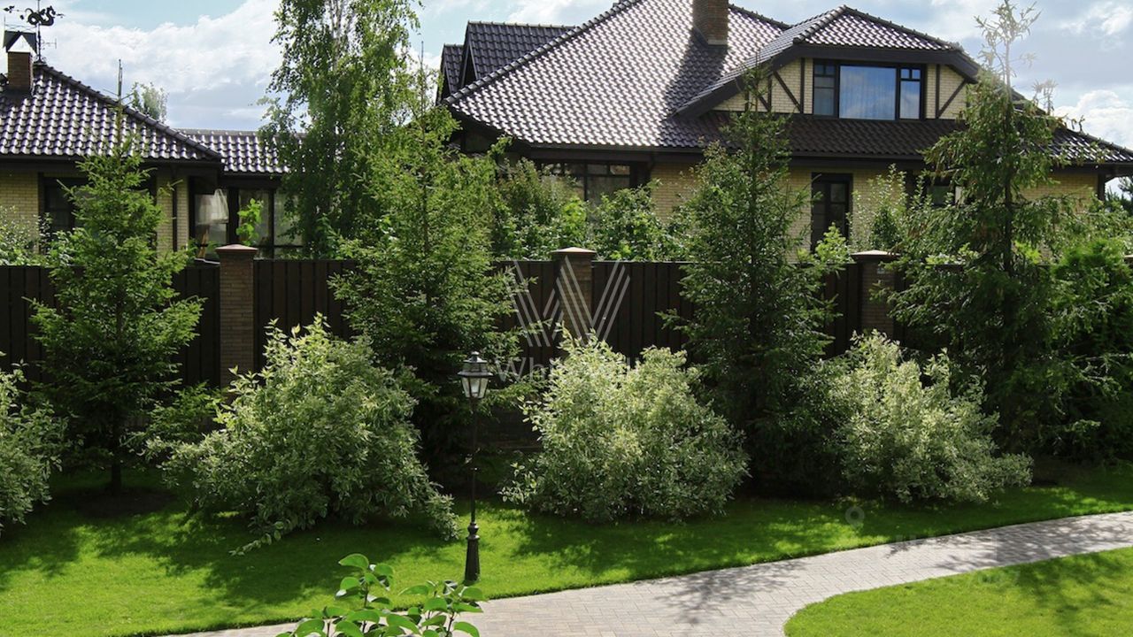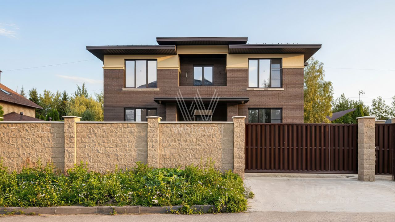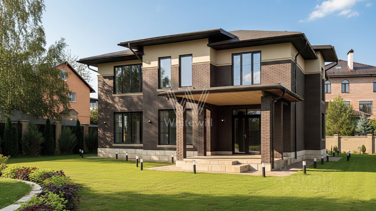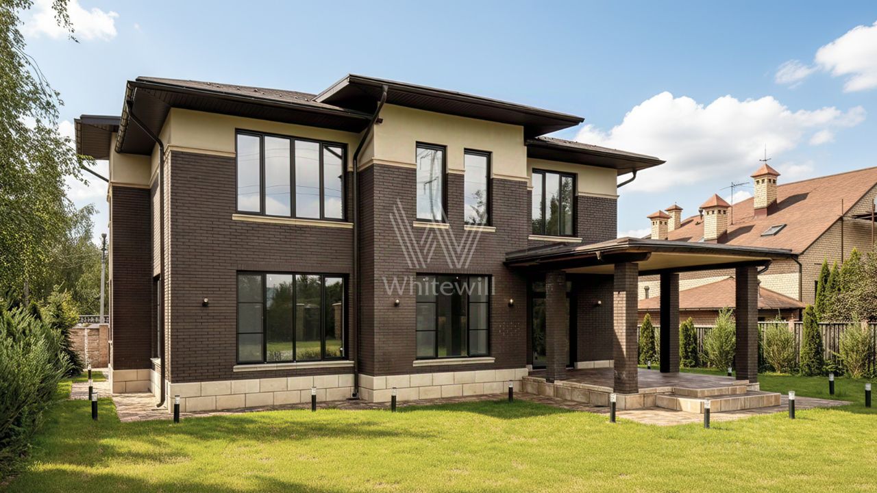 Горки-2 СТ. Загородный дом площадью 324 м² построен на полевом участке 10 соток. Фасад здания облицован коричневым клинкерным кирпичом. Резиденция с отделкой white box подходит для реализации индивидуального дизайн-проекта. Планировка коттеджа включает 4 спальни, гостиную, кухню и столовую. На участке можно выполнить ландшафтный дизайн, обустроить беседку с зоной барбекю.