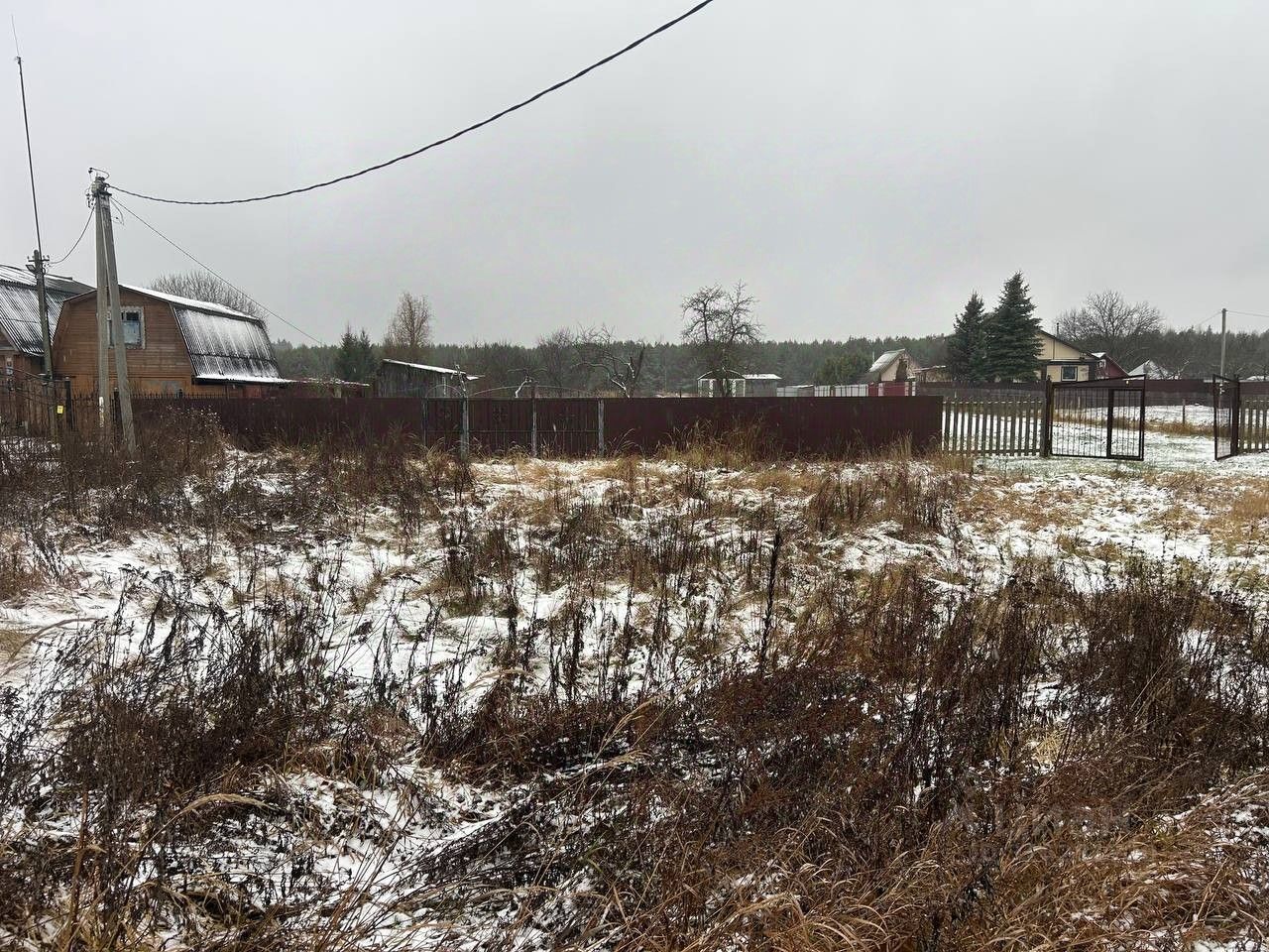 Стоит постройка для проживания во время стройки и уличный туалет. Так же на участке небольшой парник. Газ идет по границе участка. На лицевой стороне участка установлены вороты и забор.